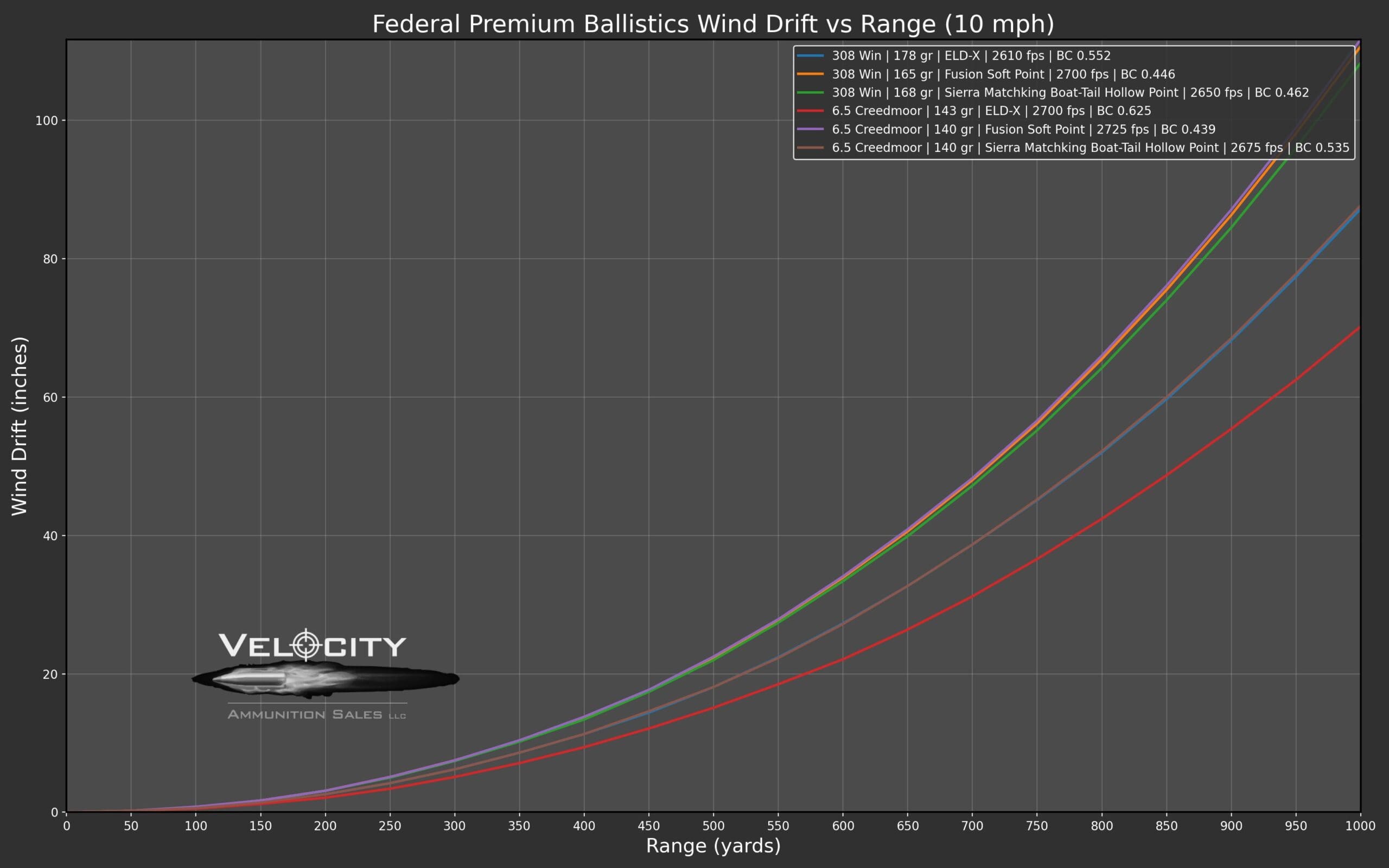 At 1000 yards, the gap becomes even wider. The .308 Winchester drifts 87.2 inches while the 6.5 Creedmoor drifts 70.2 inches.