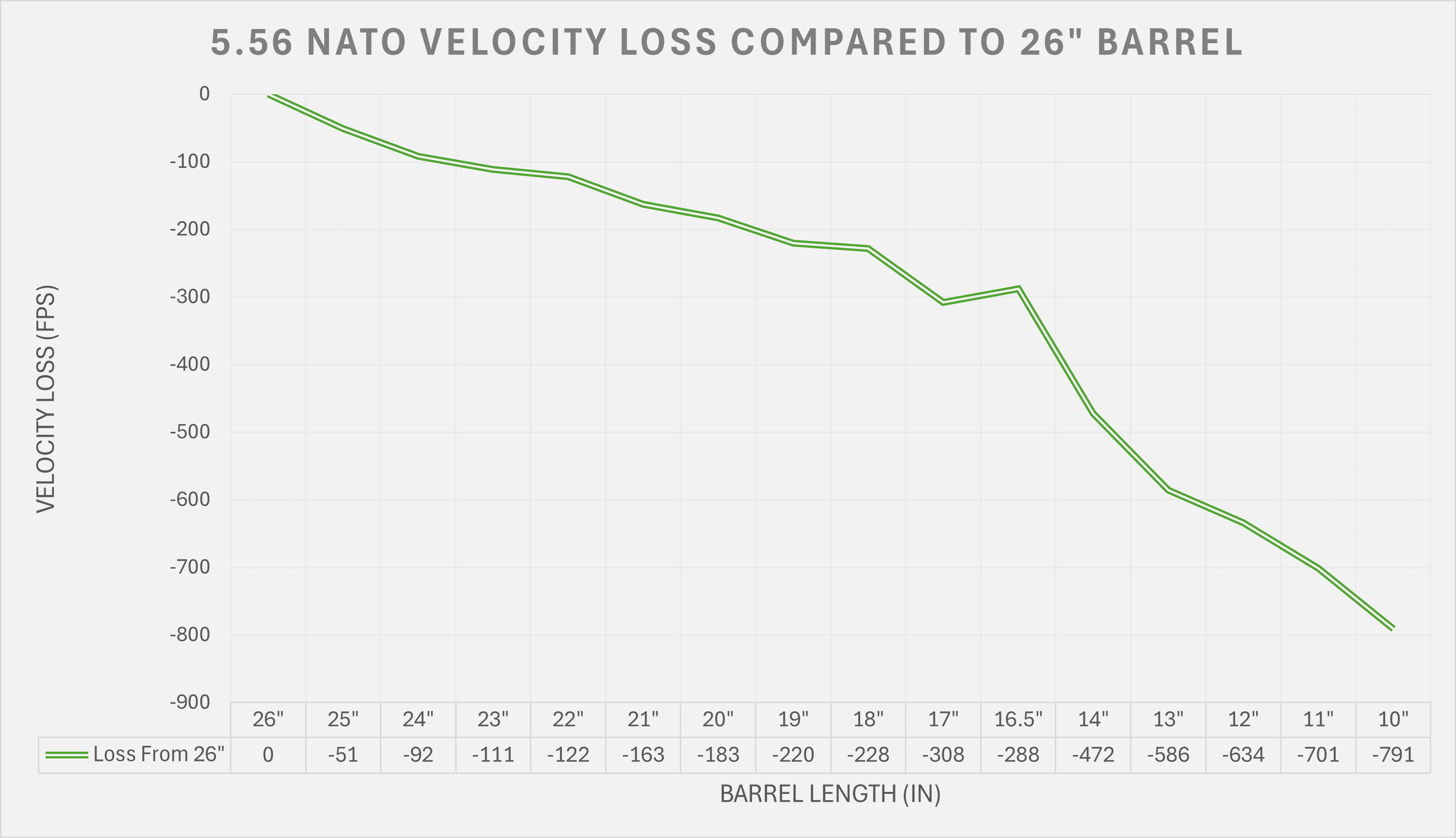That is a meaningful difference of roughly 20-50 fps per inch in the typical range, with bigger drops in the shortest barrels.