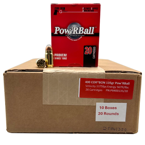 The .400 CorBon is a necked-down .45 ACP case designed to fire .40 caliber bullets, delivering impressive velocity and energy. Its higher pressure and efficient case design result in flat-shooting ballistics, reduced bullet drop, and powerful terminal performance. .400 Cor-Bon is packaged in boxes of 20 Rounds or Cases of 200 Rounds.