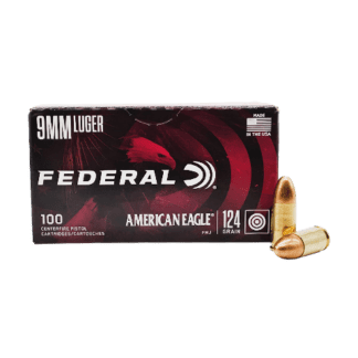 This Federal American Eagle 124 Grain 9mm is top quality American made Ammunition. The bullet style is a round nose FMJ, loaded into a brass case and uses non-corrosive primers. Federal 9mm Luger is packaged in boxes of 100 Rounds or 500 Round Cases.